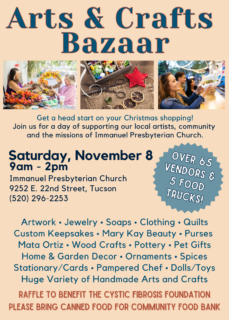 Join us for our Annual Arts and Craft Bazaar on Saturday, November 8 from 9:00am – 2:00pm.